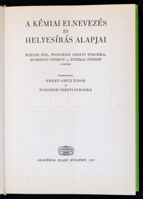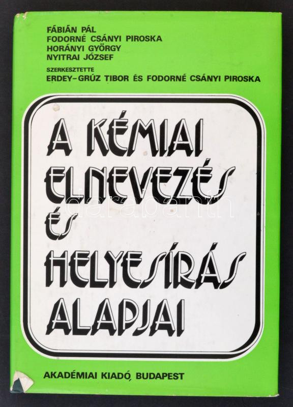 Erdey-Grúz Tibor, Fodorné Csányi Piroska: A kémiai elnevezés és helyesírás alapjai. Bp., 1977, Akadémiai Kiadói. Kiadói egészvászon kötés, kiadói kissé szakadozott papírborítóban.