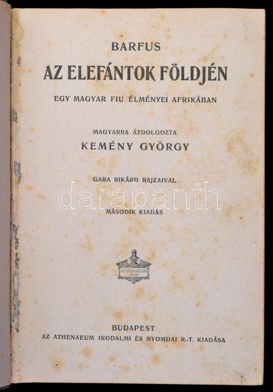 Barfus: Az elefántok hazájában. Egy magyar fiú élményei Afrikában. Magyarra átdolgozta Kemény György. Gara RIkárd rajzaival. Második kiadás. Bp., Athenaeum. Festett egészvászon kötésben. Néhán y lap kissé foltos.
