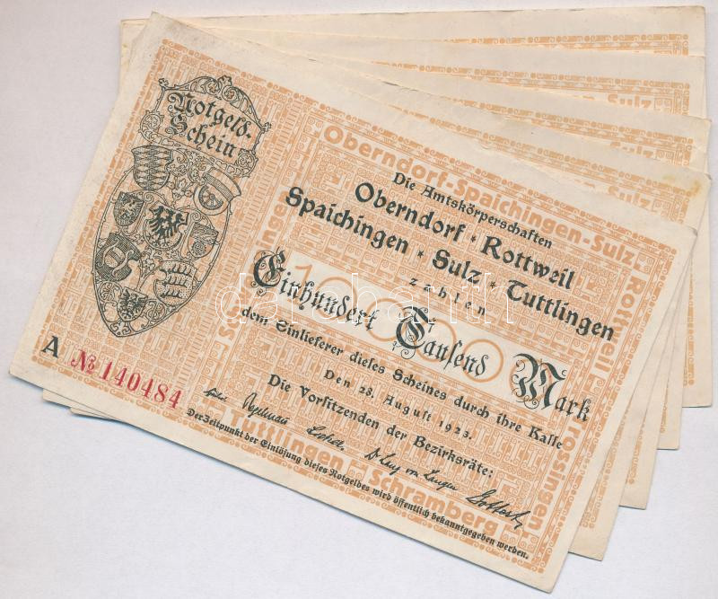 Németország / Weimari Köztársaság / Oberndorf, Rottweil, Spaichingen, Sulz, Tuttlingen 1923. 100.000M (10x) T:III Germany / Weimar Republic / Oberndorf, Rottweil, Spaichingen, Sulz, Tuttlingen 1923. 100.000 Marks (10x) C:F