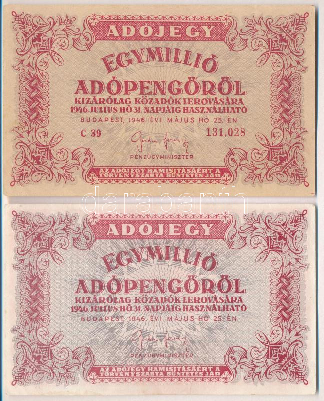 Beschreibung: 1946. 1.000.000AP (2x) egyiken 6 sorszámjel és fordított címer, másik sorozat- és sorszám nélküli T:I-,II