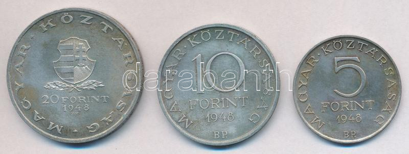 Beschreibung: 1948. 5Ft Ag "Petőfi" + 10Ft Ag "Széchenyi" + 20Ft Ag "Táncsics" - "Szabadságharc sor" T:2 kis ph.