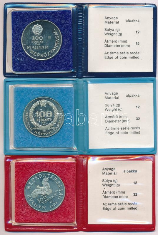 Beschreibung: 1983. 100Ft alpakka "Simon Bolivár" + 1983. 100Ft alpakka "Czóbel Béla" + 100Ft alpakka "Széchenyi István" mindegyik eredeti tokban, tanúsítvánnyal T:PP,1(PP)