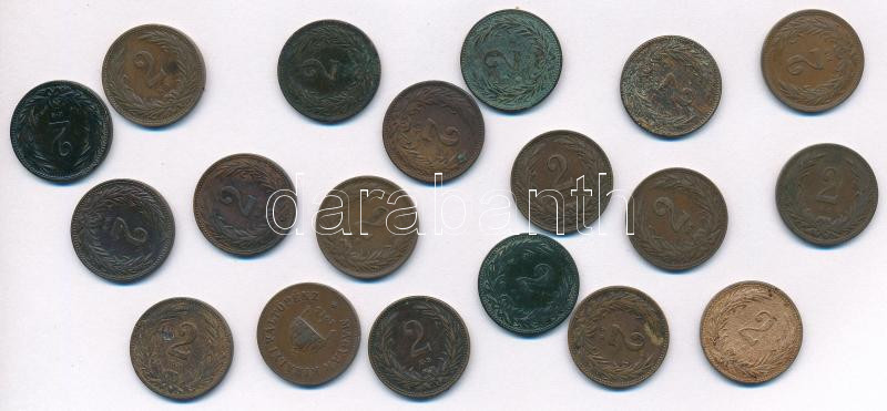 19db-os 2 filléres gyűjtemény, a korona pénzrendszer teljes sora az 1892 és 1900-as évjáratok nélkül: 1893-1899. 2f Cu (7xklf) + 1901-1910. 2f Cu (10x) + 1914-1915. 2f (2x) T:II-III