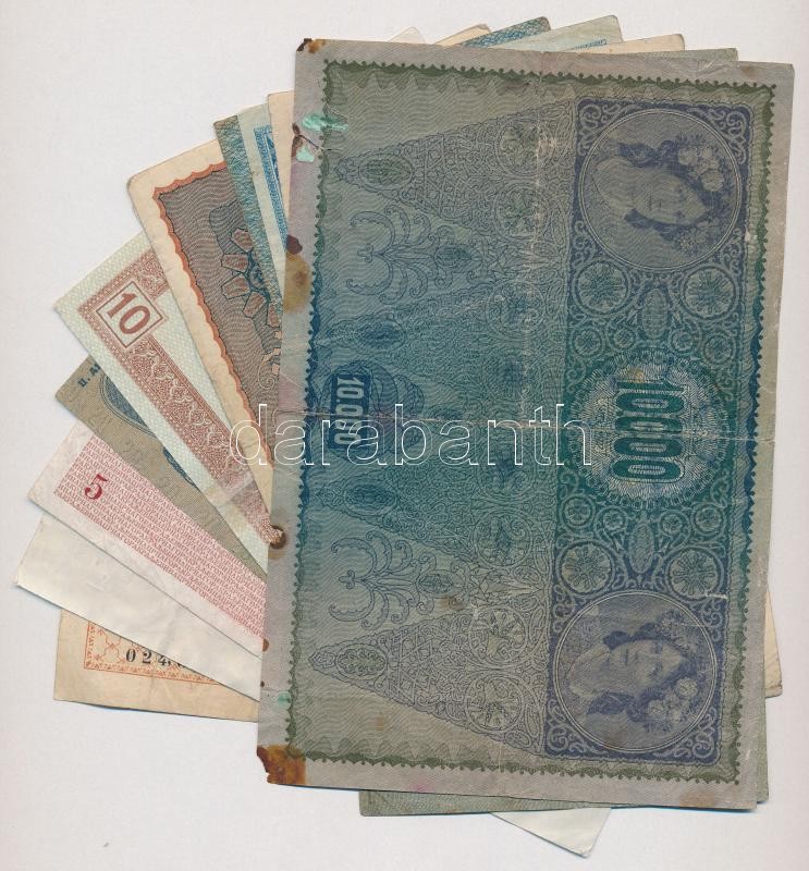 12db-os vegyes magyar és külföldi bankjegy, közte Ausztria / Osztrák-Magyar Bank 1922. 5000K, Szerb-Horvát-Szlovén Királyság 1919. 1D "4K" felülbélyegzéssel T:III,III-,IV ly., ragasztás 129cs of various banknotes including Austria / Österreichisch-Ungarische Bank 1922. 5000 Kronen, Kingdom of the Serbs, Croats and Slovenes 1919. 1 Dinar with "4 Kronen" overprint C:F,VG,G hole, sticked