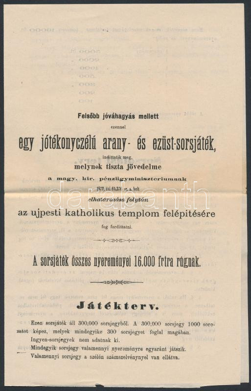Beschreibung: 1873 Jótékonysági arany és ezüst sorsjáték hirdetménye, amely bevételét az újpesti katolikus templom felépítésére szántak, jó állapotban.