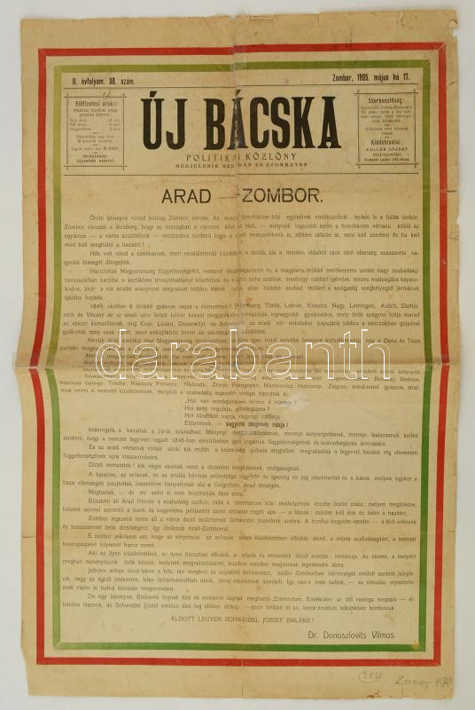 1905 Zombor, Az Új Bácska politikai közlöny II. évfolyamának 38. száma... https://www.darabanth.com/de/286-Fernauktion/286.0/Andere-Sammelgebiete/Drucksachen~27/1905-Zombor-Az-Uj-Bacska-politikai-kozlony-II-evfolyamanak-38-szama-ragasztott~II1498361