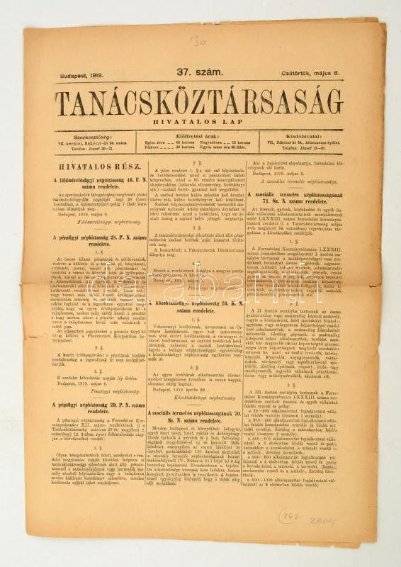 1919. május 8. A Tanácsköztársaság hivatalos lapjának 37. száma https://www.darabanth.com/de/286-Fernauktion/286.0/Andere-Sammelgebiete/Drucksachen~27/1919-majus-8-A-Tanacskoztarsasag-hivatalos-lapjanak-37-szama~II1498697