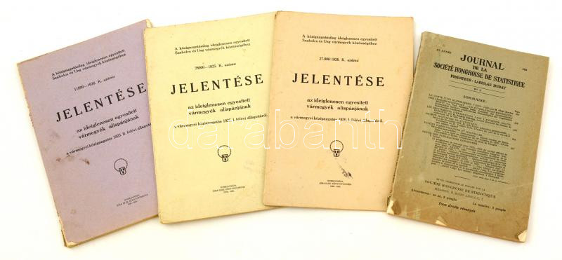 1925-1932 4 db nyomtatvány: Jelentés az ideiglenesen egyesített Szabolcs és Ung vármegyék alispánjainak a vármegyei közigazgatás állapotáról, 1925 I-II. félév és 1926. I. félév, A Magyar Statisztikai Társaság francia nyelvű 1932-es évkönyve