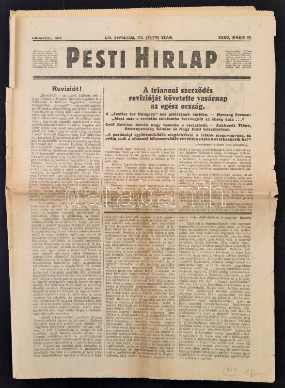 Beschreibung: 1932 Bp., A Pesti Hírlap LIV. évfolyamának 113. száma, benne a trianoni revízióról szóló cikkel