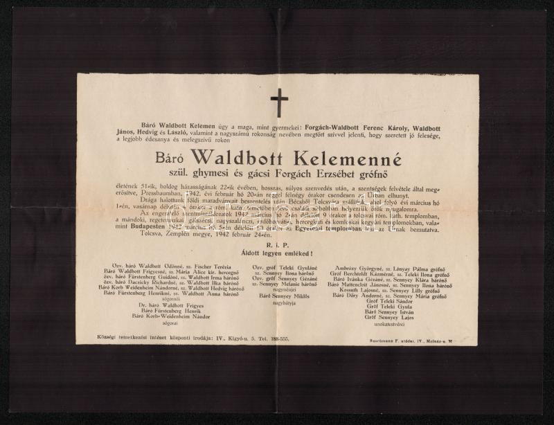 Beschreibung: 1942 Waldbott Kelemen báró (1882-1945) agrár- és erdészeti politikus felesége, Forgách Erzsébet grófnő (1891-1942) gyászjelentése
