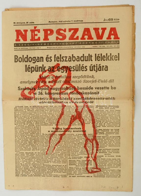 1948 Bp., A Népszava, a Szociáldemokrata Párt Központi Lapja 76. évfol... https://www.darabanth.com/de/286-Fernauktion/286.0/Andere-Sammelgebiete/Drucksachen~27/1948-Bp-A-Nepszava-a-Szocialdemokrata-Part-Kozponti-Lapja-76-evfolyamanak-56-szama~II1498675