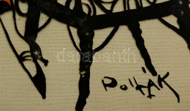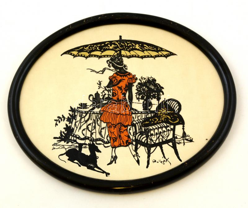 Beschreibung: Pollák jelzéssel: Hölgy kutyával. Sziluett kép, kollázs, papír, üvegezett keretben, 23×29 cm