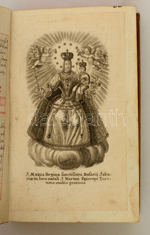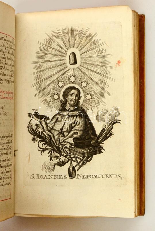 1774 Jó illatú rosás kert, melyben sok szép imádságok mint annyi jó illatú rosák találtotnak reggveli s estveli imádságok az Úr vitele előtt és utánno való könyörgisek. A Jesus szentséges szivihez való officium. Az igen szentséges annyához a Szűz Máriához és egyéb Istennek dicsőültt szenteihez igen szép ajtatosságok. Kéziratos imádságos könyv 8 db metszettel. Kicsit kopott bőrkötésben, jó állapotban.