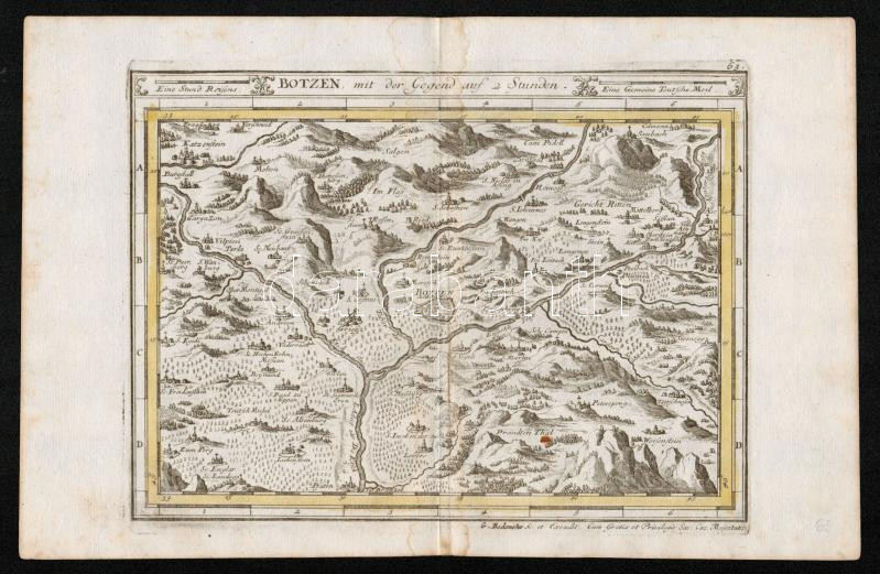 cca 1700 Dél Tirol Bozen térképe. Botzen. Johann Hofmann: Díszes kartusú, színezett rézmetszet. Megjelent: Atlas Curieux oder neuer und Compendieuser Atlas. (Augsburg, 1700?). Méret: 29x20 cm / cca 1700 Map of Bozen South Tirol Colored etching 31x20 cm