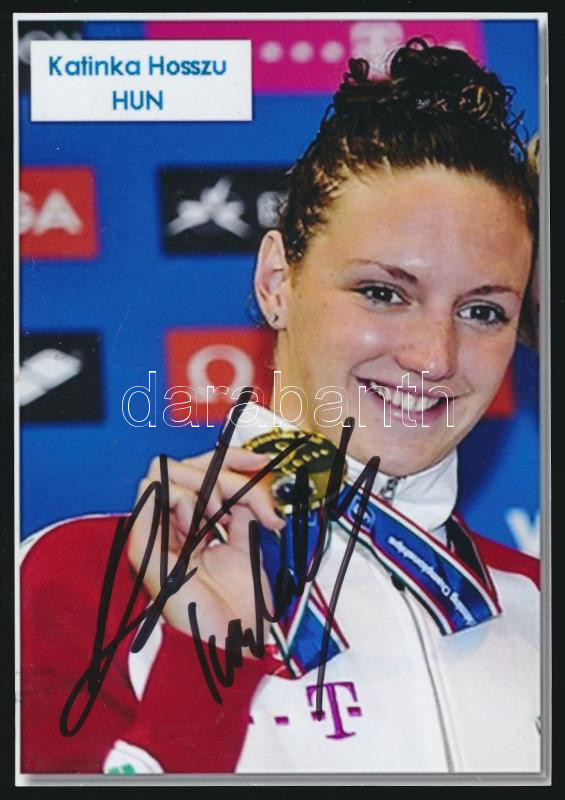 Hosszú Katinka (1989-) háromszoros olimpiai, ötszörös világ-, és tizenháromszoros Európa-bajnok úszúnő aláírása egy őt ábrázoló fotón, 12x8 cm. / autograph signature