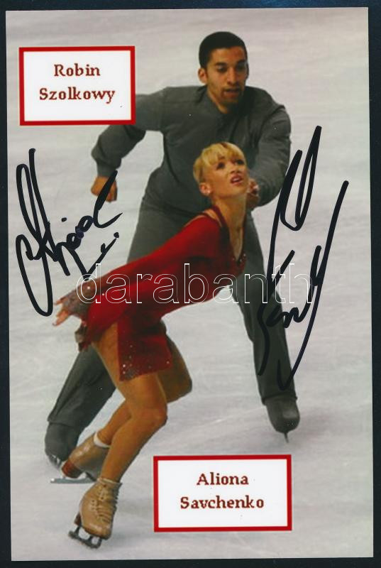 Robin Szolkowy (1979-) és Aliona Savchenko (1984-) olimpiai bronzérmes, világ-, és Európa-bajnok ukrán műkorcsolyázó páros aláírásai az őket ábrázoló fotón, 15x10 cm./ a