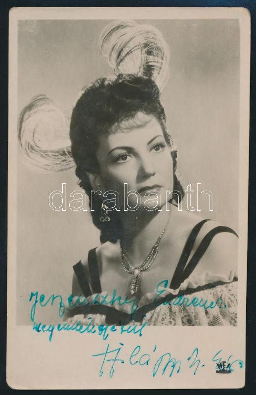 Beschreibung: Szilágyi Szabó Eszter (1915-) színésznő dedikációja egy őt ábrázoló fotólapon, 13x9 cm.