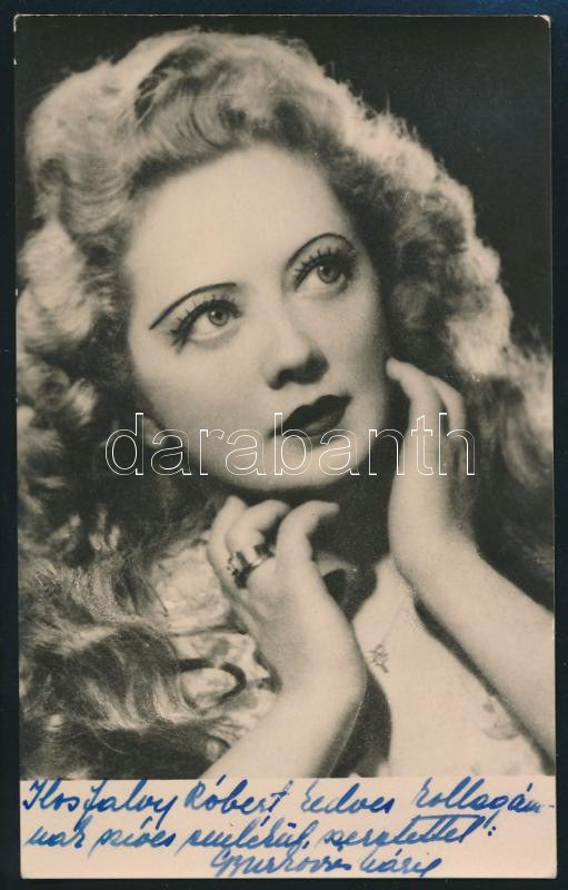 Beschreibung: cca 1940 Gyurkovics Mária (1913-1973) operaénekesnő dedikációja egy őt ábrázoló fotólapon, 13x8 cm