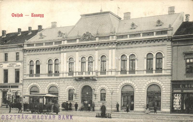 Beschreibung: Eszék, Osijek, Essegg; Fischer, Carl Laubner üzletei, bútorraktár, villamos / shops, furniture store, tram (EK)