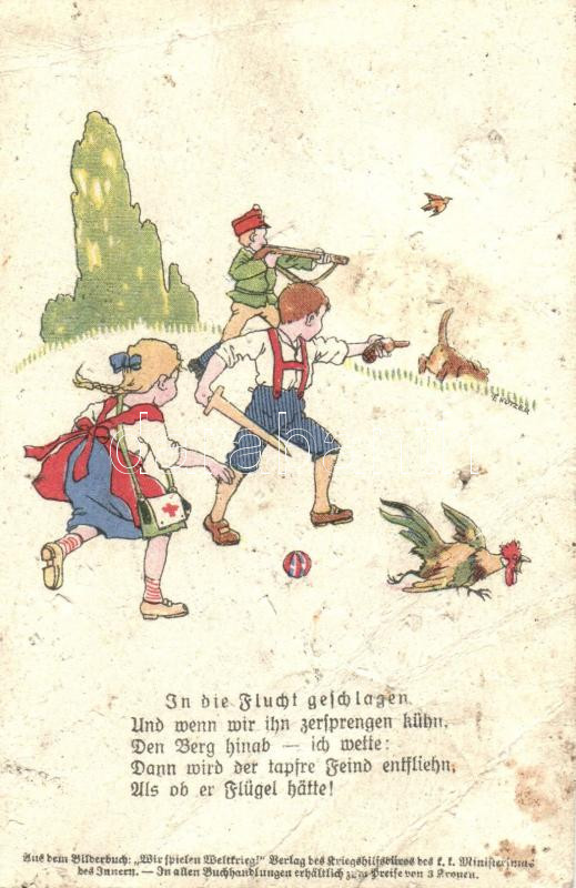 Beschreibung: 'In die Flucht geschlagen' - Wir spielen Weltkrieg! Bilderbuch Nr. 74-18 / Children playing world war, WWI Red Cross military aid postcard (lyuk / hole)
