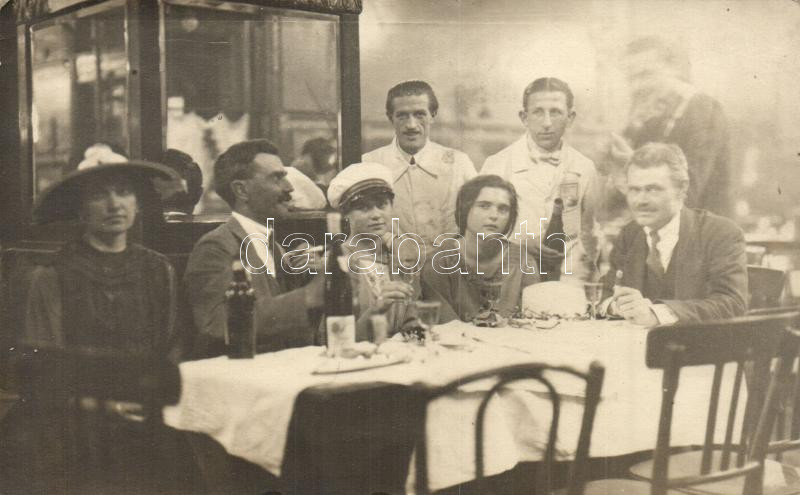 Beschreibung: 1922 Budapest VI. Teréz körút 19., Sorrentó Nagy Kávéház és Étterem, italozó társaság, pincérek, belső, photo