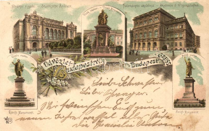 Beschreibung: Budapest, Fővárosi vigadó, Tudományos akadémia, Deák, Eötvös és Petőfi szobor, floral, litho