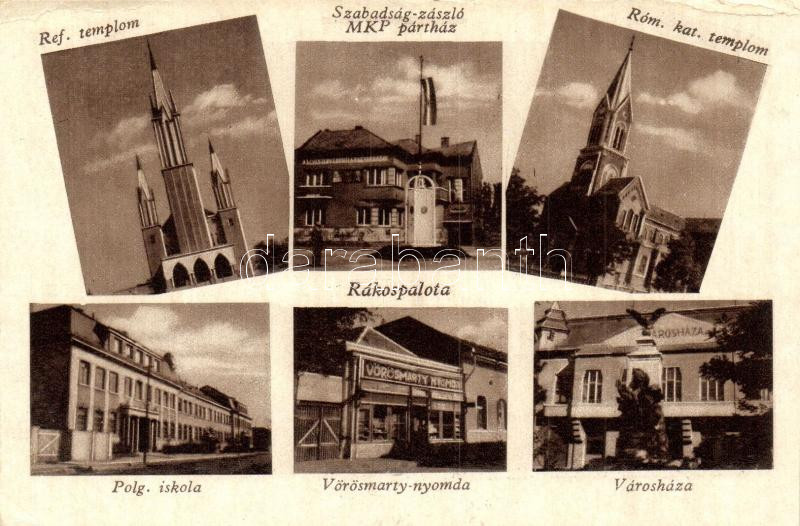 Budapest XV. Rákospalota, Szabadság zászló az MKP pártház előtt, városháza, polgári iskola, Vörösmarty nyomda és saját kiadása (kis szakadás / small tear)