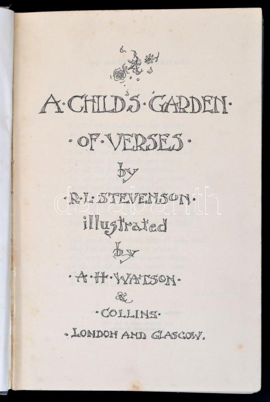 R.L. Stevenson: A Child's Garden of Verses. Illusztrálta A. H. Watson. London-Glasgow, 1946, Collins Sons & Co. Kiadói egészvászon kötés, kissé kopottas borítóval, fekete-fehér szövegközti és egészoldalas színes illusztrációkkal, az előzéklapokon és a hátsó kötéstábla belsején jegyzetekkel.