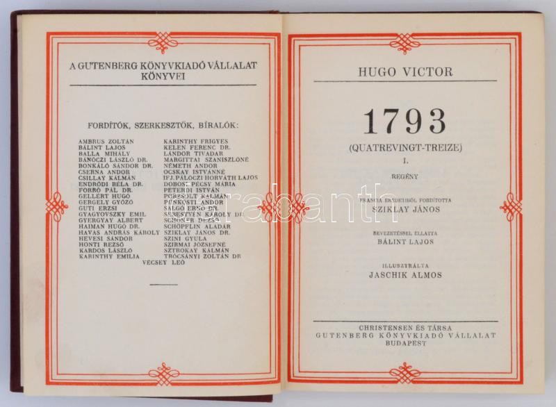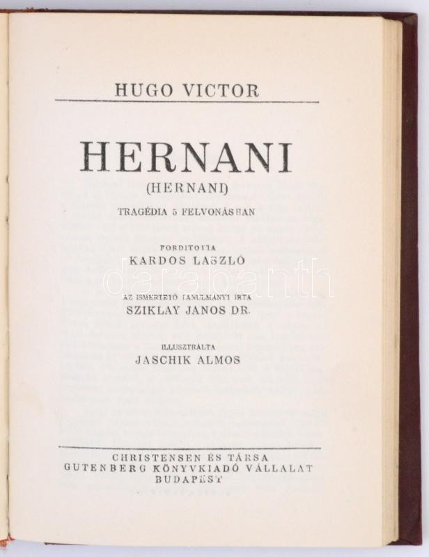 Hugo Victor: 1793 I-III. Hernani. Fordította: Sziklay János, Kardos László. Illusztrálta Jaschik Álmos. Hugo Victor összes regényei és elbeszélései. Bp., én., Christensen és Társa Gutenberg Könyvkiadó Vállalat. Kiadói aranyozott egészvászon kötés. Jó állapotban.