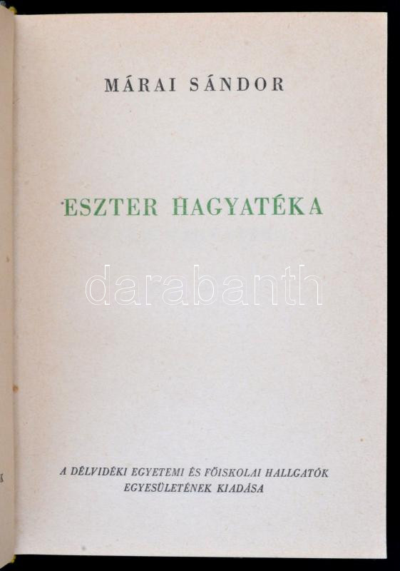 Márai Sándor: Eszter hagyatéka. Magyar Regények. h.n., é.n., Délvidéki... https://www.darabanth.com/de/286-Fernauktion/286.0/Bucher/Bucher-Sonstige-Raritaten~44/Marai-Sandor-Eszter-hagyateka-Magyar-Regenyek-hn-en-Delvideki-Egyetemi-es-Foiskola~II1466884