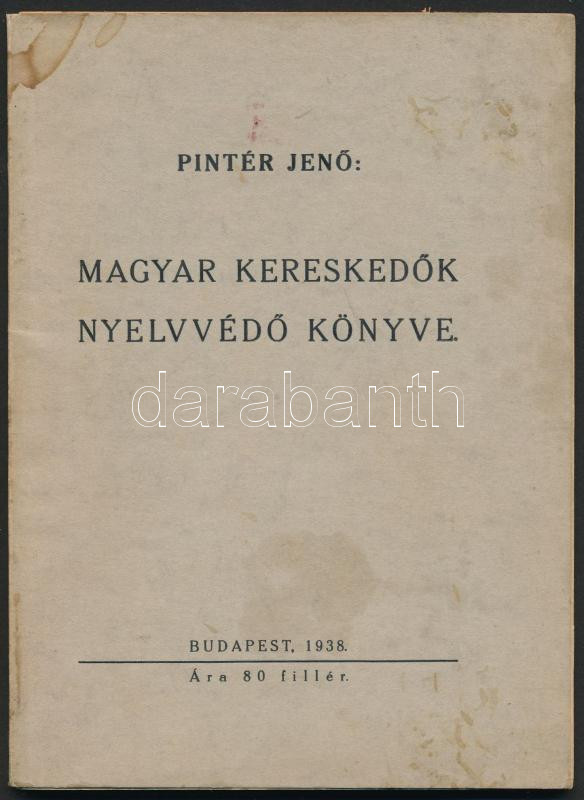 Pintér Jenő: Magyar kereskedők nyelvvédő könyve. Bp., 1938, Kissé folt... https://www.darabanth.com/de/286-Fernauktion/286.0/Bucher/Bucher-Sonstige-Raritaten~44/Pinter-Jeno-Magyar-kereskedok-nyelvvedo-konyve-Bp-1938-Kisse-foltos-papirkotesben-bo~II1440211