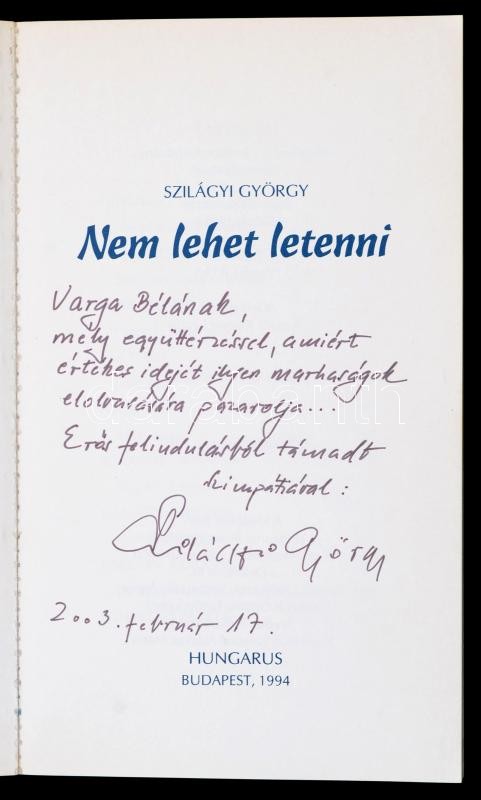 Szilágyi Gyürgy: Nem lehet letenni. Bp., 1994, Hungarus. A szerző álta... https://www.darabanth.com/de/286-Fernauktion/286.0/Bucher/Bucher-Sonstige-Raritaten~44/Szilagyi-Gyurgy-Nem-lehet-letenni-Bp-1994-Hungarus-A-szerzo-altal-dedikalt-peldany-Pap~II1496797