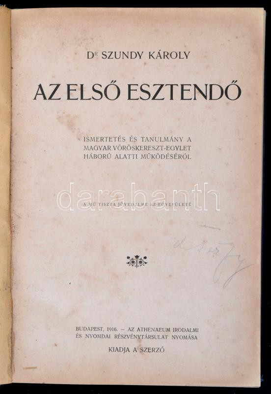 Szundy Károly: Az első esztendő. Ismertetés és tanulmány a Magyar Vöröskereszt-Egylet háború alatti működéséről. Bp., 1916, szerzői. Kopott vászonkötésben.