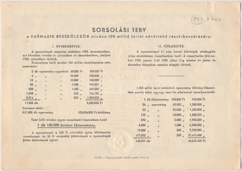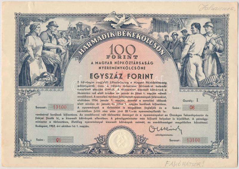 1952. "Harmadik Békekölcsön" sorsjegy 100Ft-ról, szárazpecséttel, fakó... https://www.darabanth.com/de/286-Fernauktion/286.0/Numismatik/Aktien-und-Tickets~400004/1952-Harmadik-Bekekolcson-sorsjegy-100Ft-rol-szarazpecsettel-fako-hatter-TI-II~II1497426