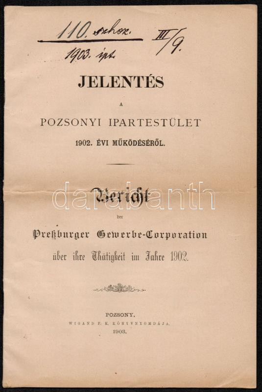 1902 Report from the Bratislava Guild, Bratislava F. K. Wigand Bookpress, Hungarian and German languages, 15+1 p.