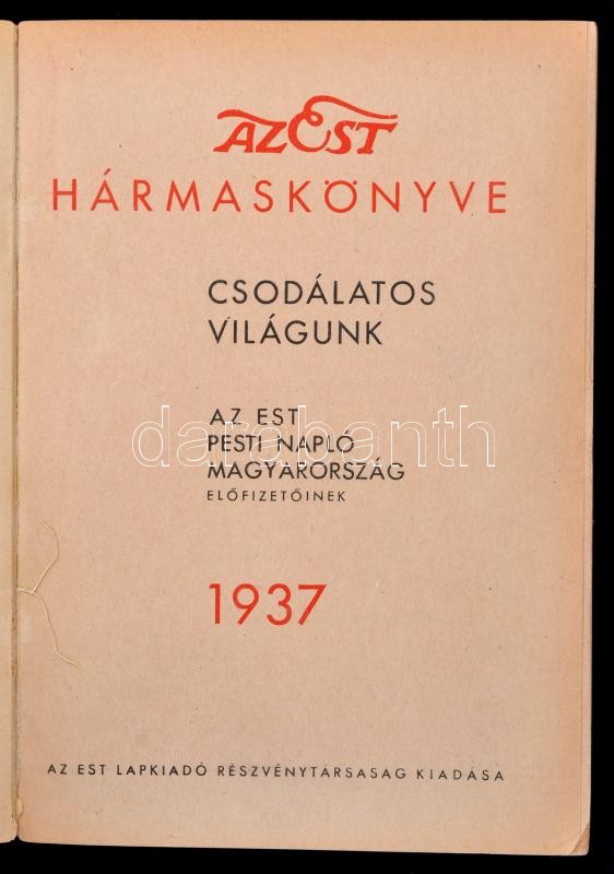 1937 Az Est hármas könyve. Bp, Est Lapkiadó. Kiadói papírkötésben, kis... https://www.darabanth.com/de/287-Fernauktion/287.0/Andere-Sammelgebiete/Drucksachen~100027/1937-Az-Est-harmas-konyve-Bp-Est-Lapkiado-Kiadoi-papirkotesben-kisse-kopottas-papirbor~II1503476