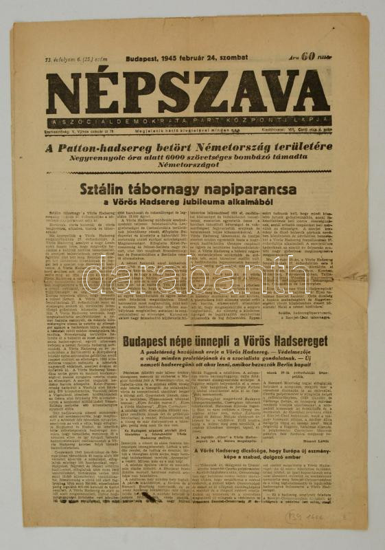 1945 A Népszava 73. évfolyamának 6. száma, címlapon Sztálin napi paran... https://www.darabanth.com/de/287-Fernauktion/287.0/Andere-Sammelgebiete/Drucksachen~100027/1945-A-Nepszava-73-evfolyamanak-6-szama-cimlapon-Sztalin-napi-parancsarol-szolo-cikkel~II1507918