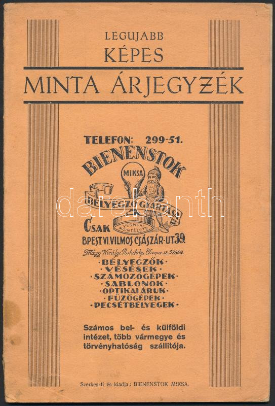 Beschreibung: cca 1929 Bp., A Bienenstok bélyegzők legújabb képes mintaárjegyzéke, 52p