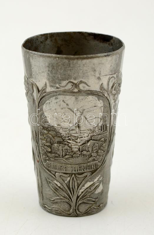 Beschreibung: Szecessziós motívumos városképes ón kupica, jelzés nélkül, d: 3,5 cm