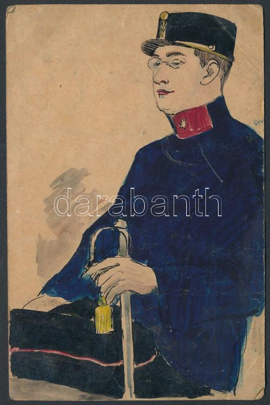 Beschreibung: 1916 Kézzel rajzolt egyedi, katonát ábrázoló levelezőlap