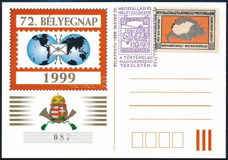 Beschreibung: 1999 72. Bélyegnap emléklap "087" sorszámmal, magánkiadás