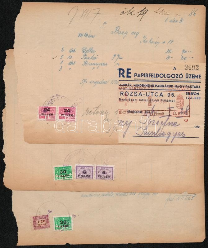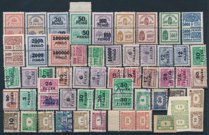 Beschreibung: 16 klf teljes számla illeték bélyeg pár + 37 db számla illeték vagy ellenőrző szelvény + 4 db számla