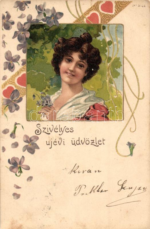 'Boldog Új Évet!' / New Year greeting card, lady, floral Art... https://www.darabanth.com/de/287-Fernauktion/287.0/Ansichtskarten/GruC39Fkarten-Feste~200077/Boldog-Uj-Evet-New-Year-greeting-card-lady-floral-Art-Nouveau-litho-EK~II1506110