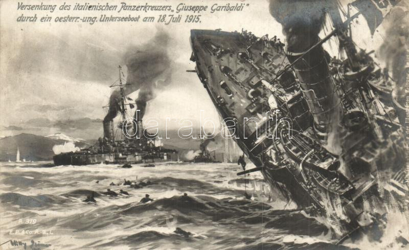 1915 'Versenkung des italienischen Panzerkreuzers 'Giuseppe Garibaldi' durch ein oesterr.-ung. Unterseeboot' / Az Olasz Királyi Haditengerészet 'Giuseppe Garibaldi' páncélos cirkáló elsüllyesztése K.u.K. tengeralattjáró által / Sinking of the Royal Italian Navy's armored cruiser ship by the submarine of the Austro-Hungarian Navy, K.u.K. Kriegsmarine s: Willy Stöwer