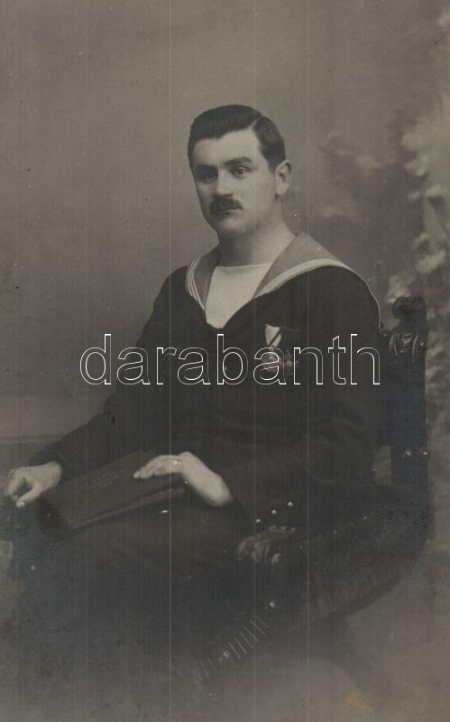 Beschreibung: Osztrák-magyar haditengerész 'Jubileumi kereszt' és Mozgósítási Kereszt 1912-1913-as Emlékkereszt kitüntetésekkel / Austro-Hungarian Navy mariner with 'Jubilee Cross' and Mobilization Cross 1912-1913 decorations, photo (fa)