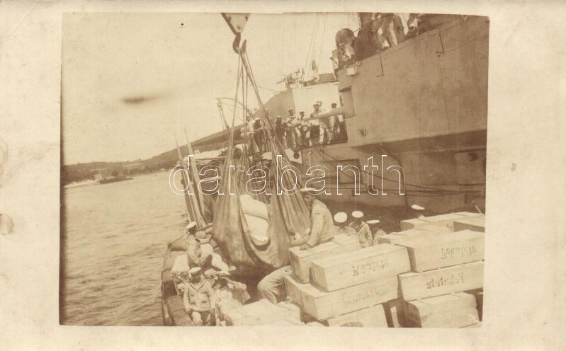Radetzky-osztályú csatahajó 100 mm-es lövegei, rakodó matrózok / Radetzky class pre-dreadnought battleship, 100 mm guns, boat with loading Austro-Hungarian Navy mariners, photo