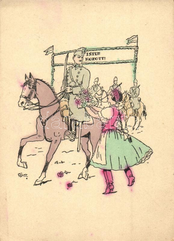 Beschreibung: Magyar katona bevonuláskor, Délvidéki Egyetemi és Főiskolai Hallgatók Egyesülete kiadása / Entry of the Hungarian troops, folklore (EK)