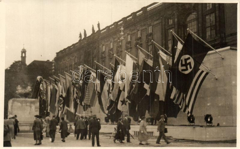 1936 Berlin, Stadtschloss im Festschmuck, Altar mit olympischer Feuerschale, Olympia / Olympic Games festive decorations on the city palace, NS flag, photo