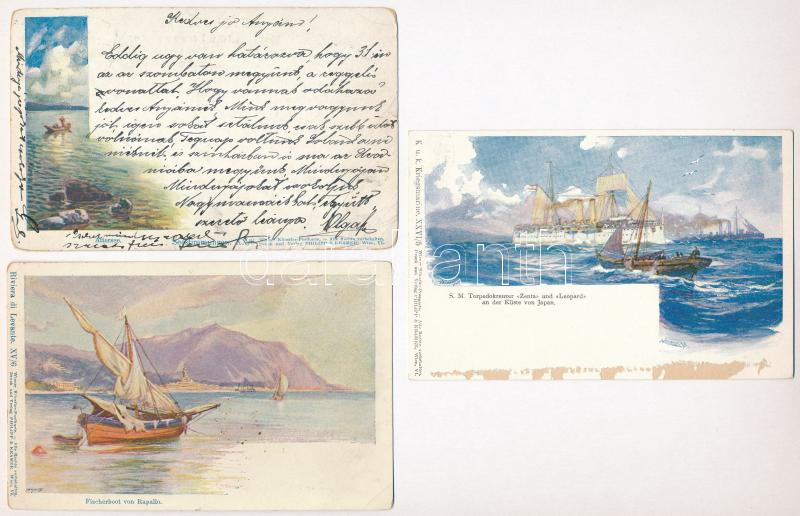3 db RÉGI hajó motívumos képeslap, Wiener Künstler Postkarte Philipp & Kramer XV/6., XX/8., XXVI/5., K.u.K. Kriegsmarine S. M. Torpedokreuzer Zenta und Leopard, vegyes minőség / 3 pre-1945 ship motive postcards, K.u.K. battleships, fishing boat, mixed quality