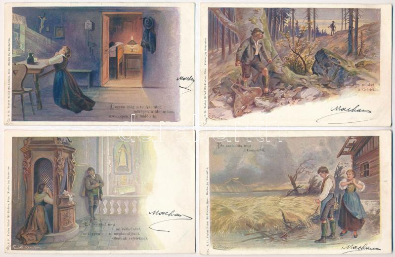 6 db RÉGI motívumos képeslap, Tízparancsolat sorozat, Döcker aláírásával, Neuber Ráfael műkiadása / 6 pre-1945 motive postcards, Ten Commandments series with the signature of Döcker